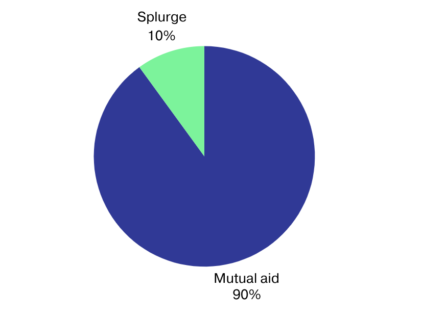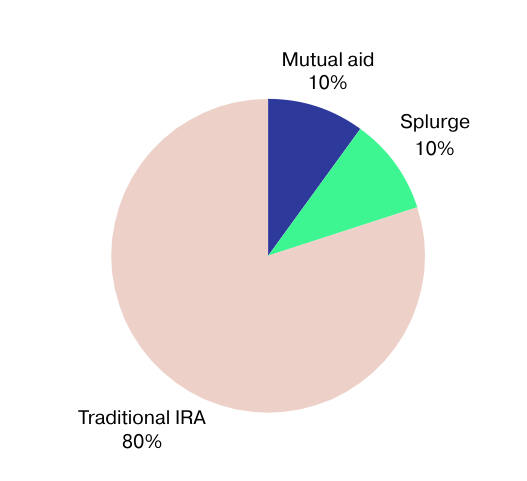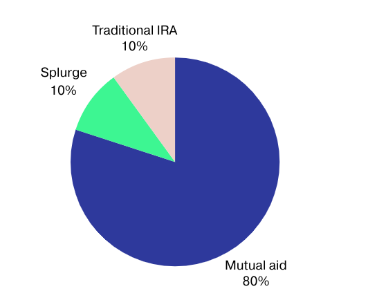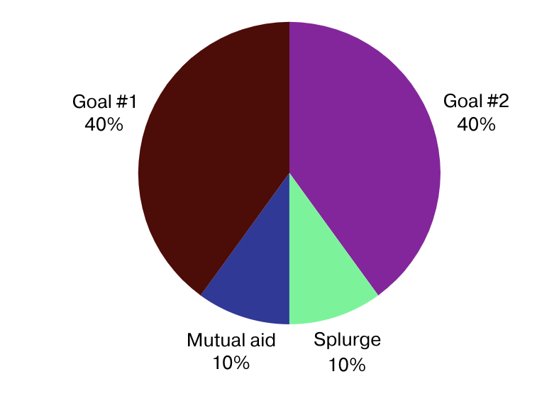 There’s a 10% mutual aid bucket, because, again, the ability to save money is a privilege. This plan allows you to put money in different savings buckets while making room for mutual aid and splurge spending.